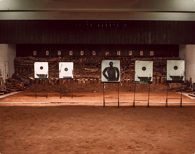 Teste armas curtas, longas e automáticas em estandes modernos e climatizados.